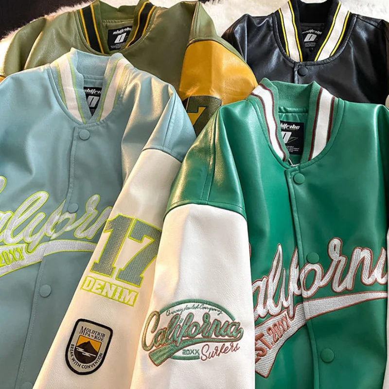American retro letter embroidered jackets coats men's motorcycle bomb street leather baseball uniform couple casual loose jacket